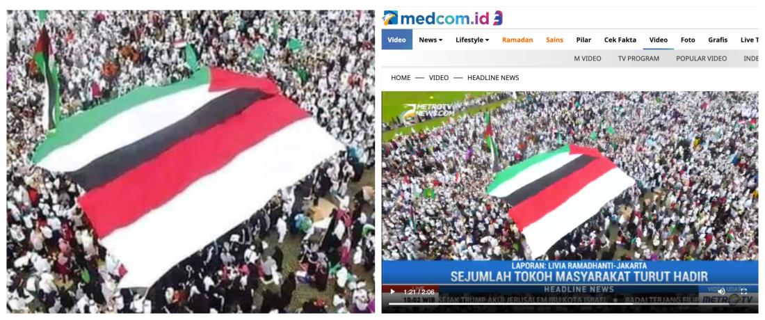 The scene that shows a giant Palestinian flag among the massive crowd can be seen in the thumbnail and from the 1:11 to 1:56 mark of the Metro TV video.