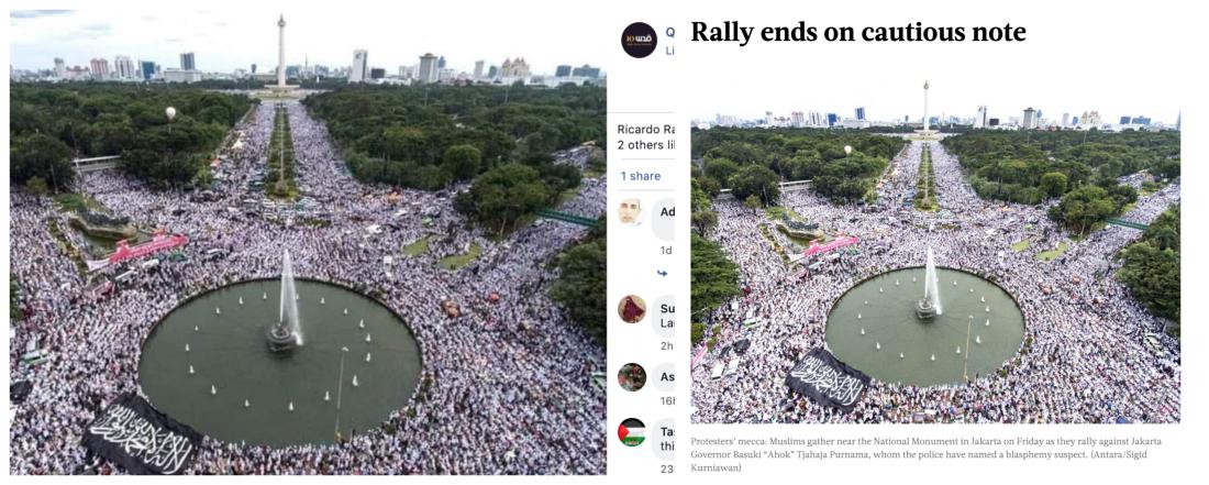The photo, credited to Antara news agency, has a caption that reads: “Protesters’ mecca: Muslims gather near the National Monument in Jakarta on Friday as they rally against Jakarta Governor Basuki ‘Ahok’ Tjahaja Purnama, whom the police have named a blasphemy suspect.”